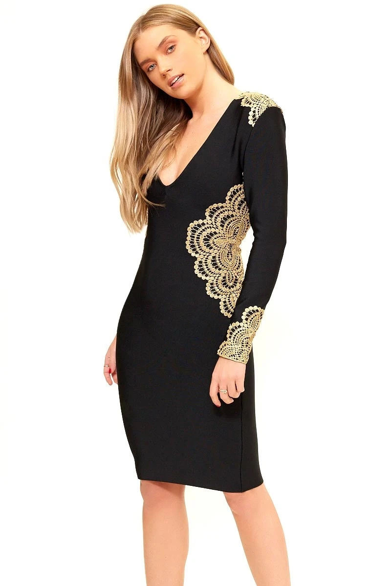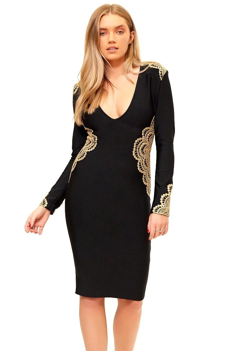 Akita – Black Long Embroidered Sleeve Bandage Dress