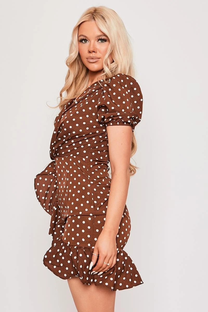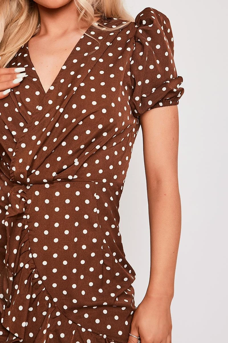 Featuring all over polka dot print, frill detailing, wrap over design and puff sleeves.