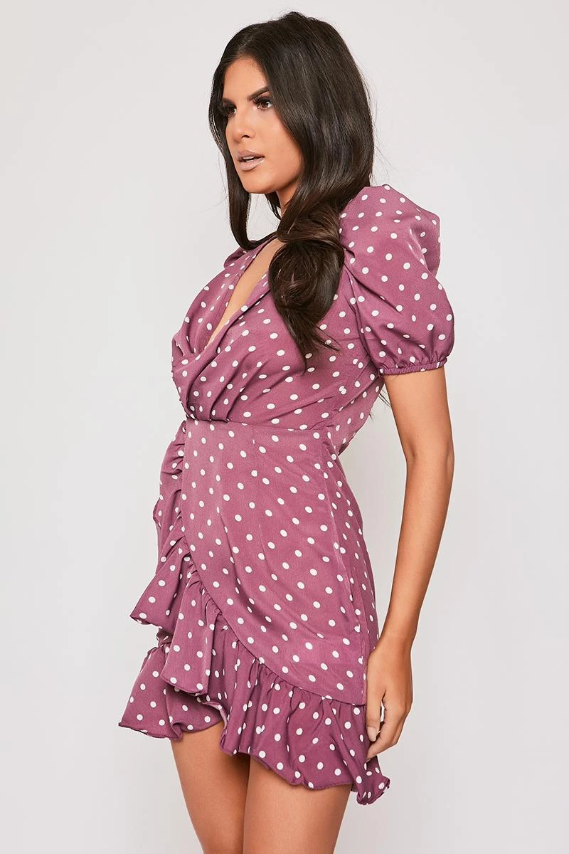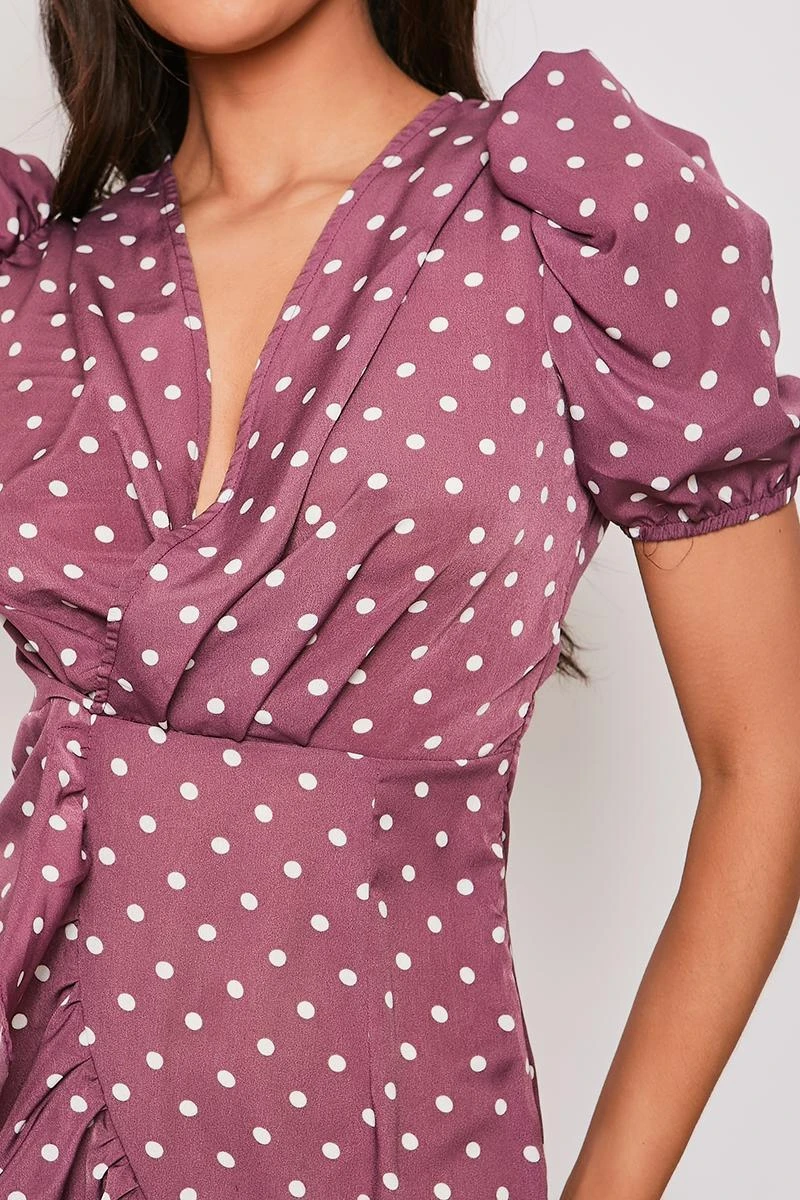Featuring all over polka dot print, frill detailing, wrap over design and puff sleeves.