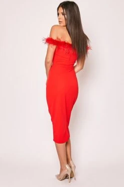 Analeigh – Red Off The Shoulder Feather Trim Bodycon Midi Dress