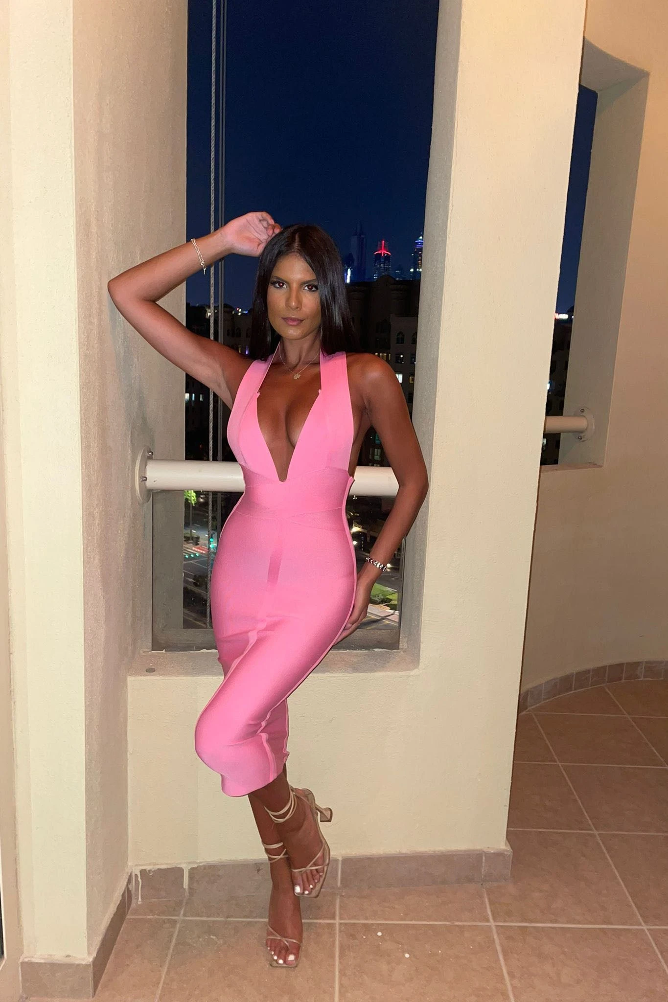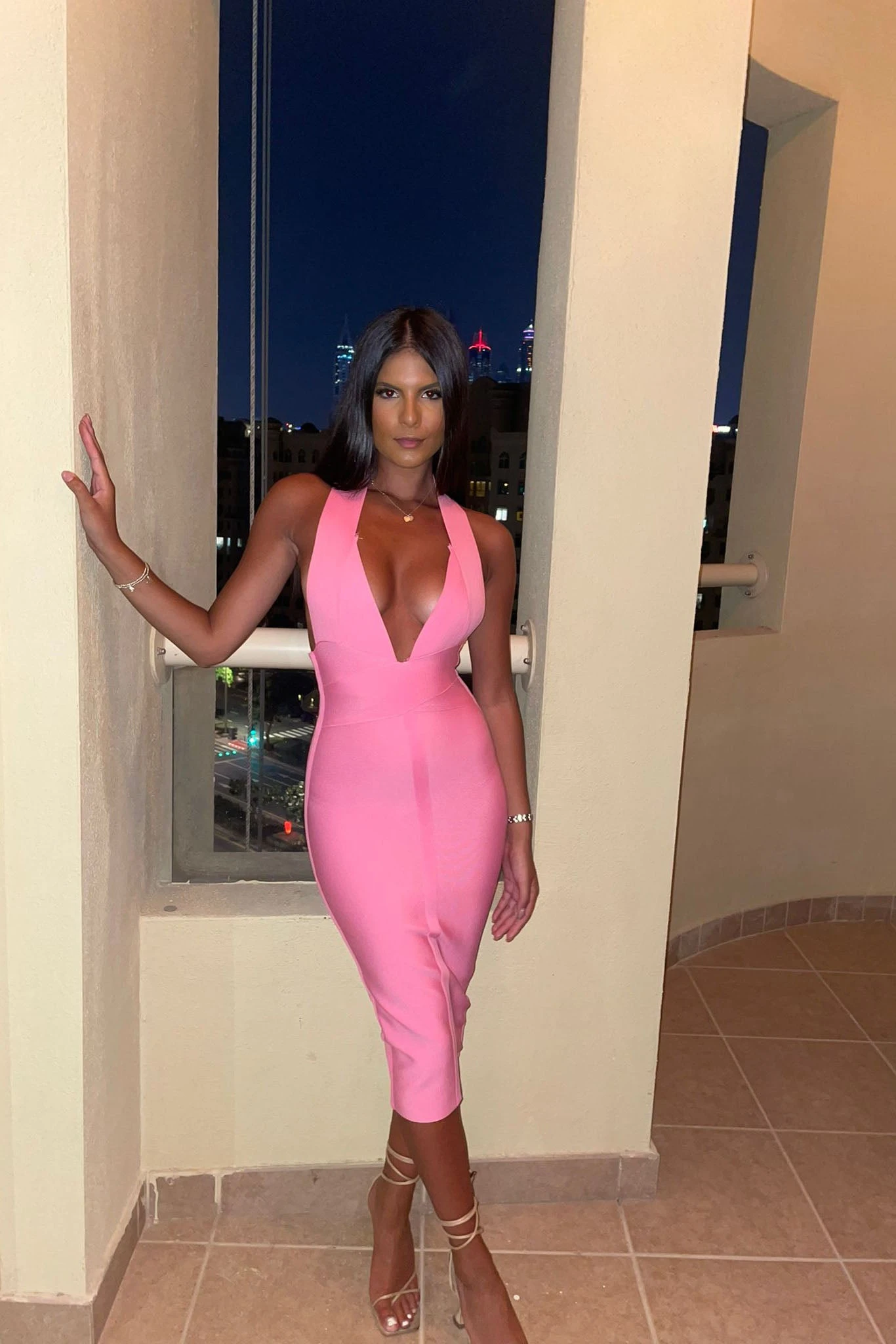 Adore the bright candy pink hue of Felicity! Gorgeous halterneck bandage dress, featuring a figure flattering low cut back and midi length. This plunge bandage dress is a curve creator!