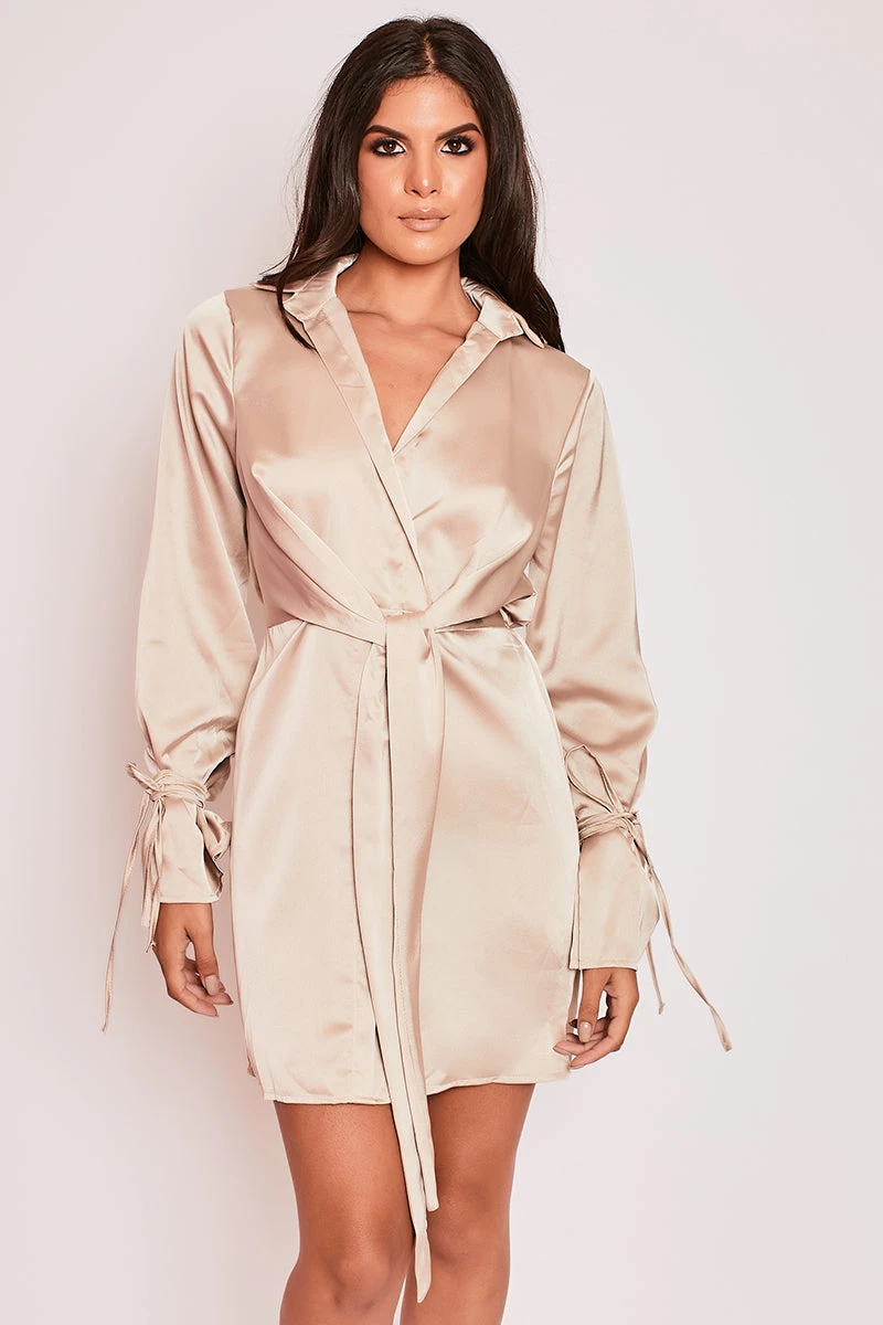 Love the satin hues and luxe champagne tone of Mae, wrap design and tie finish for your desired fit. Model is 5ft6 wearing one size.