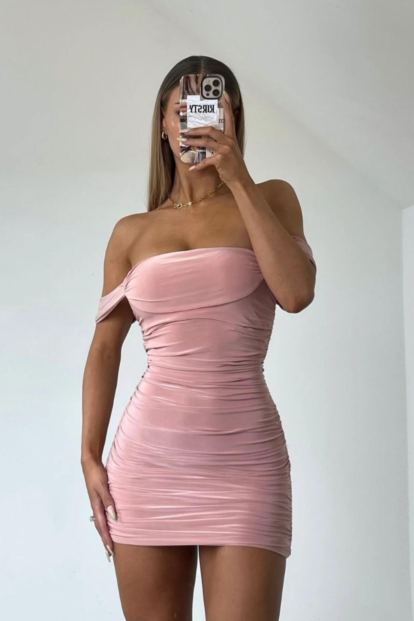 Be the first to review “Millia – Pink Slinky Draped Sleeve Ruched Mini Dress” Cancel reply