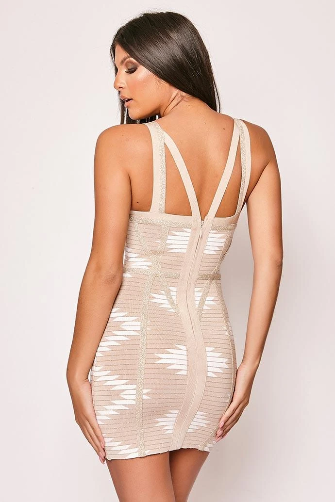 Love Montego’s nude & white shimmer! Crafted from our luxe bandage material, featuing a mini length cut, patterned detail with a shimmering gold waistband to pinch your waist in!