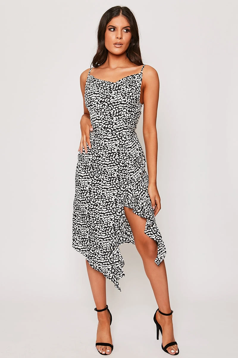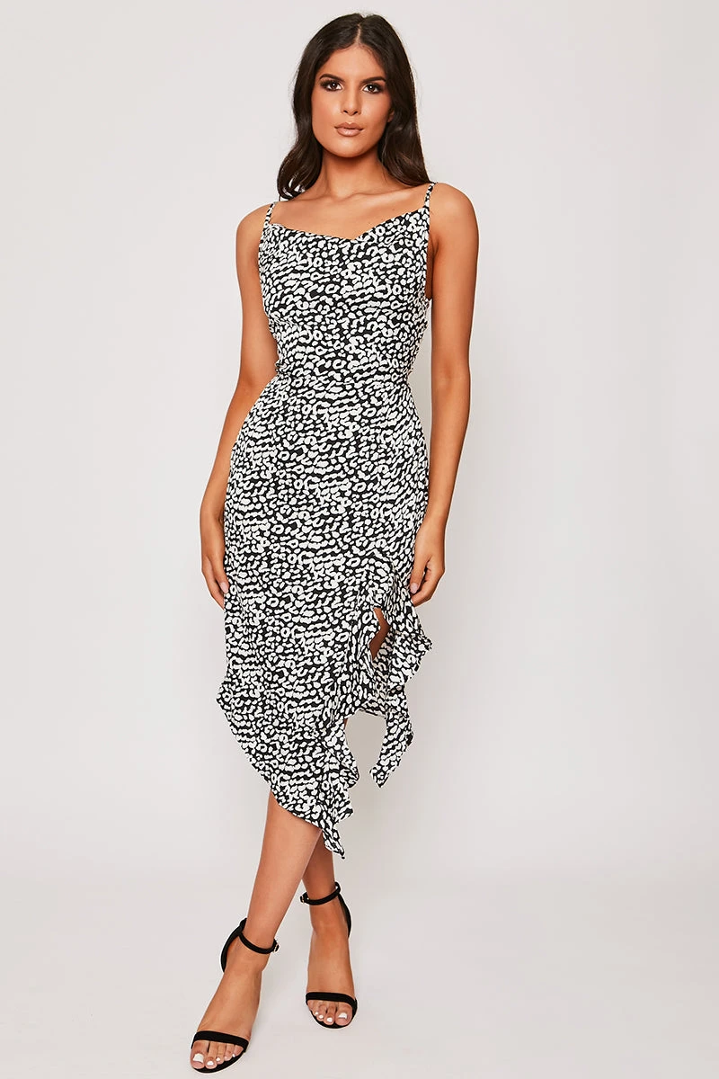 Dinner date and cocktails with the girls? Ollie is a must have, featuring a black soft satin material with a contrasting white leopard print, cowl neck detail and thigh high split.Â