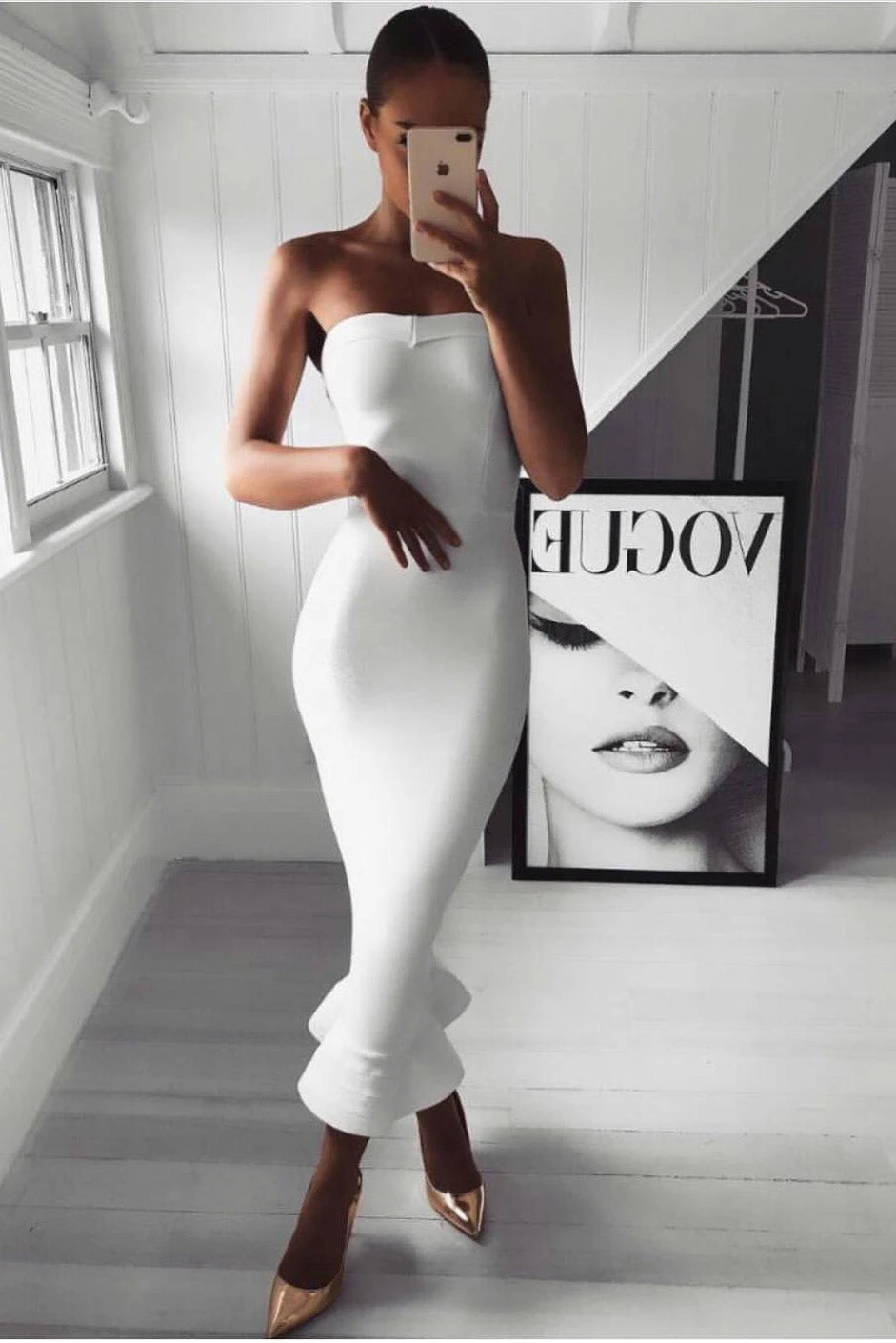 Pennie – White Strapless Fishtail Bandage Midi Dress