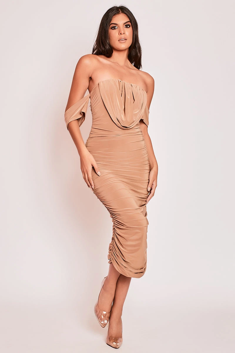 RSVP in style in Rosea! The most perfect occasion dress has arrived, love the slinky material, off the shoulder style and front drape detail.Â