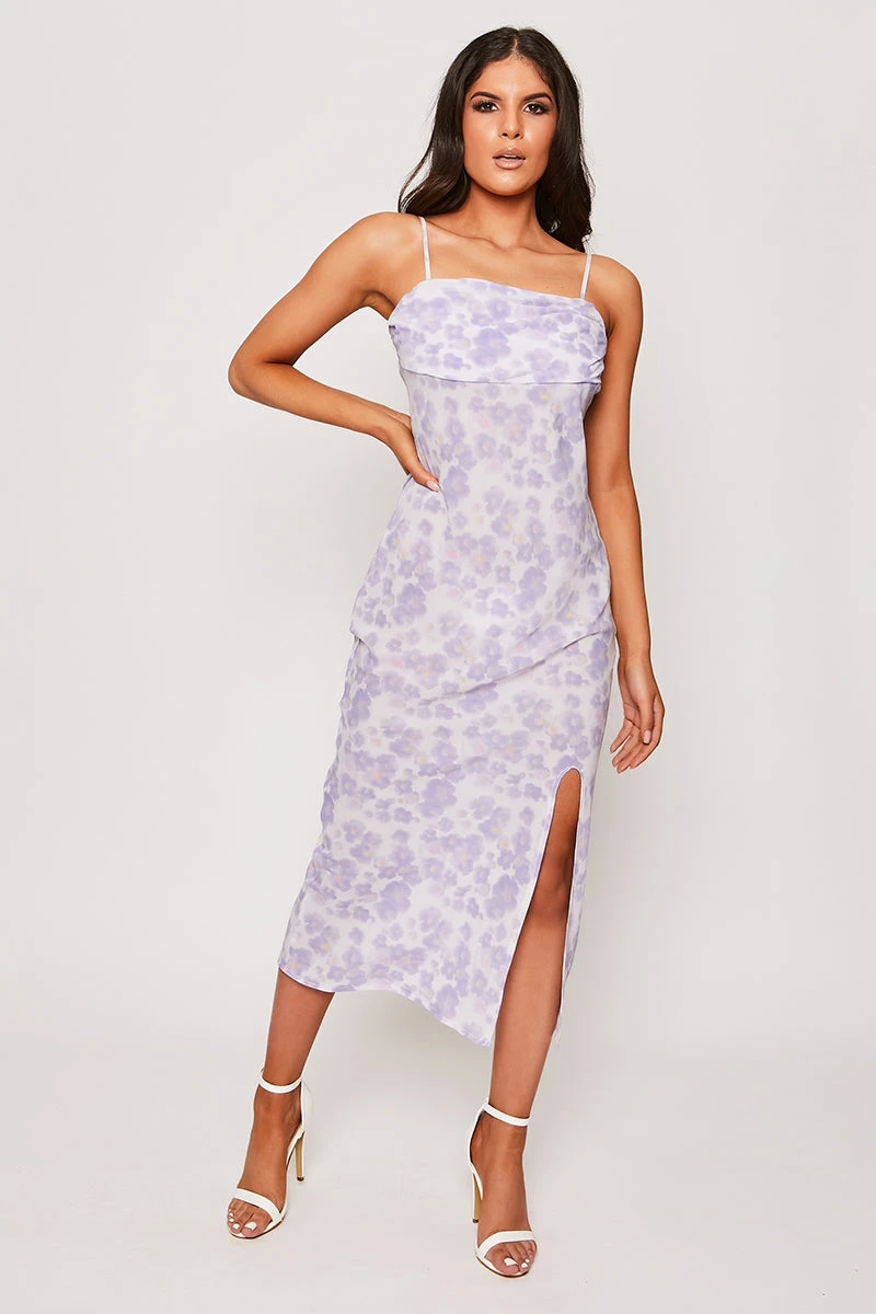 Cami style straps with a super flattering cowl neckline and thigh split finish.Â