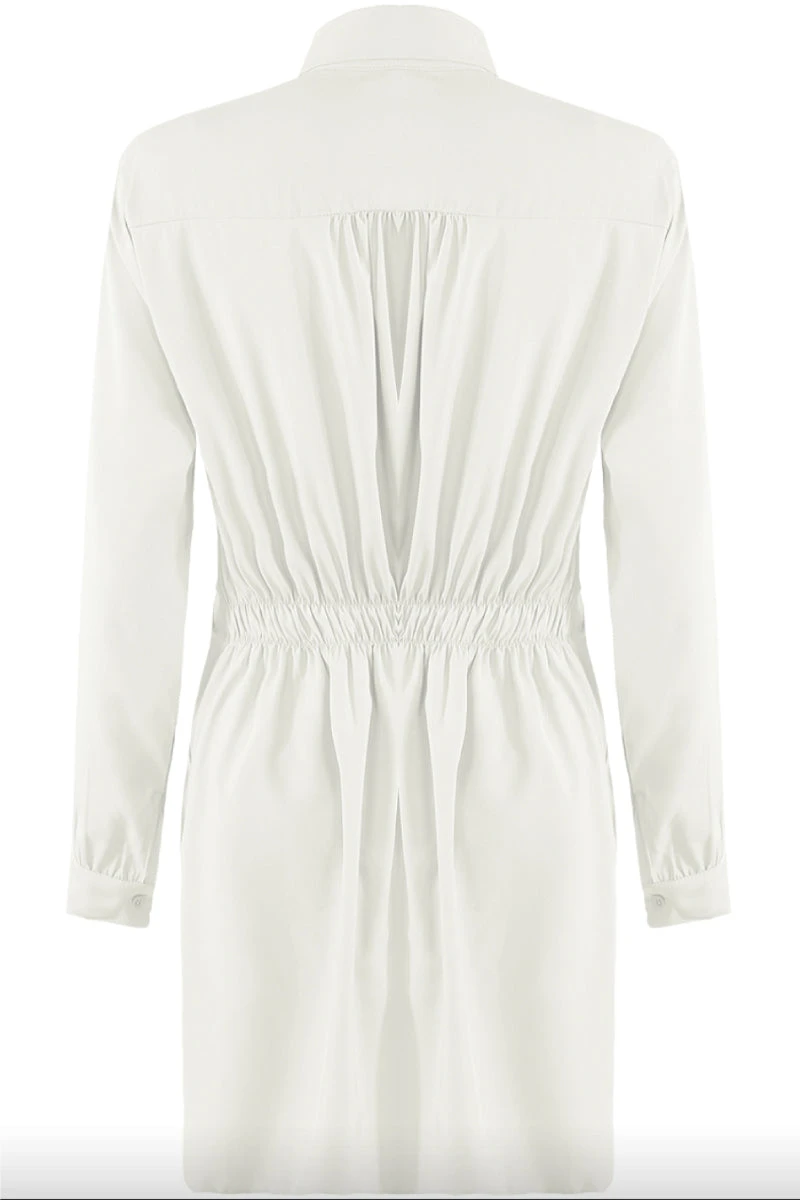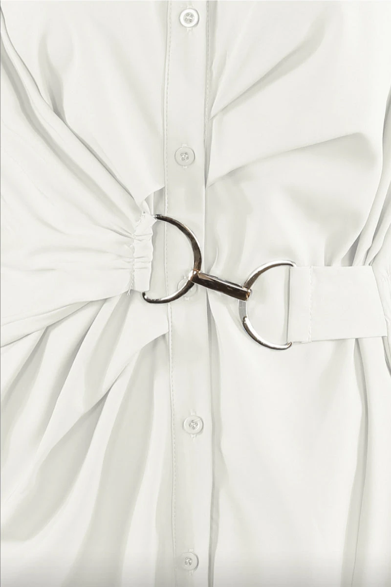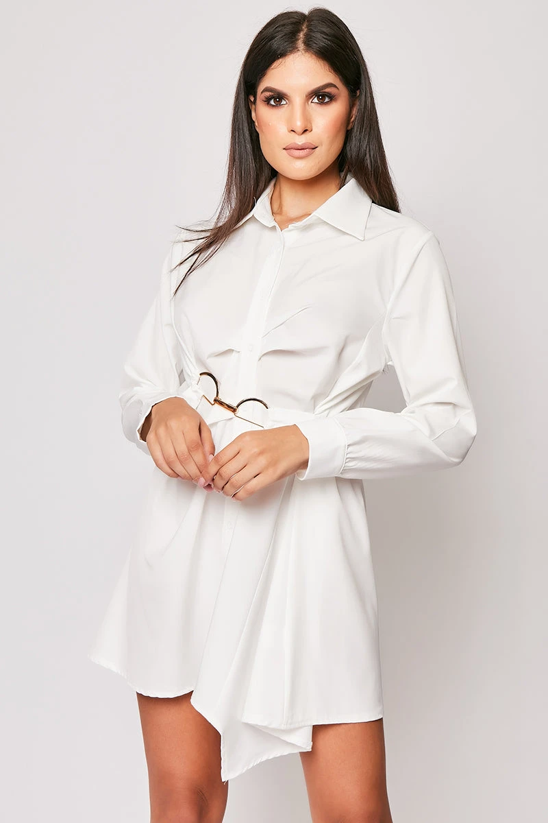 This white shirt dress is a brunch outfit saviour! Featuring long sleeves, a D- Ring detail and asymmetric hem finish. Style with some barely there heels to dress it up or some killer over the knee boots.Â