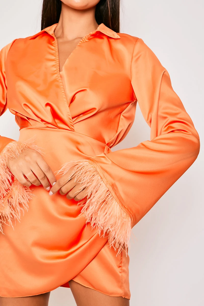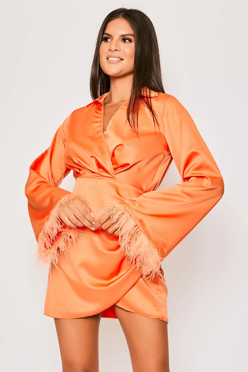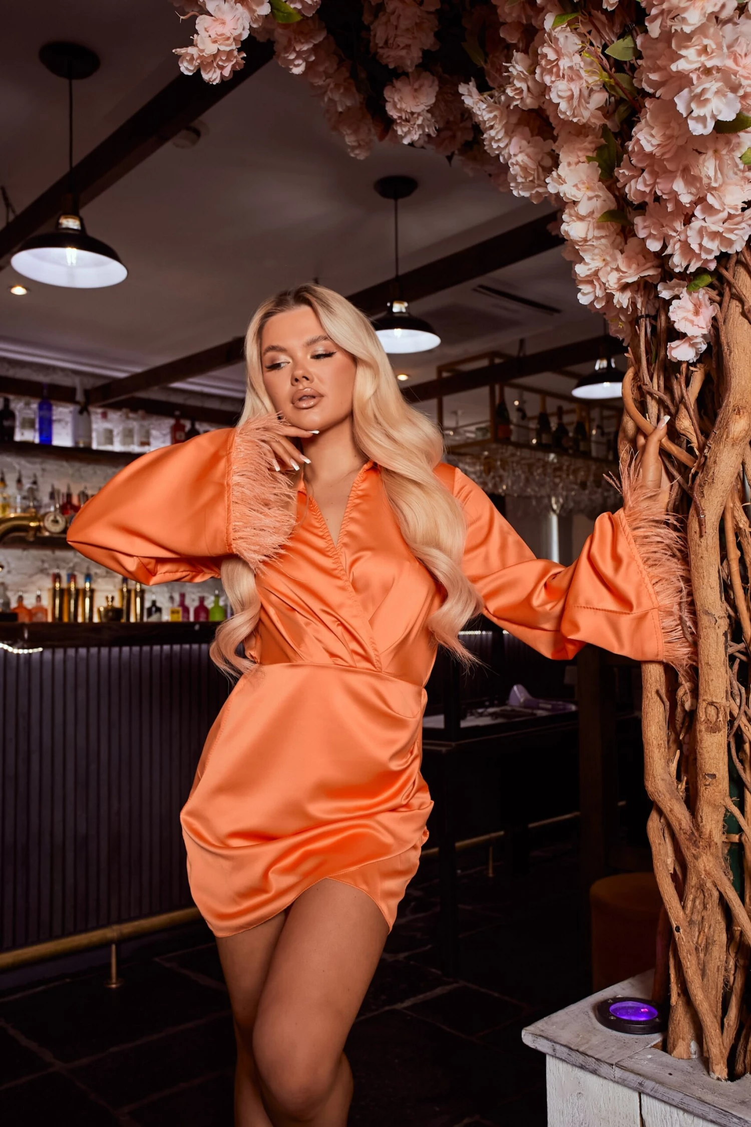 Got plans for the weekend doll? Then this dress is a must. Featuring a vibrant orange satin hue, wrap over design and feather details.
